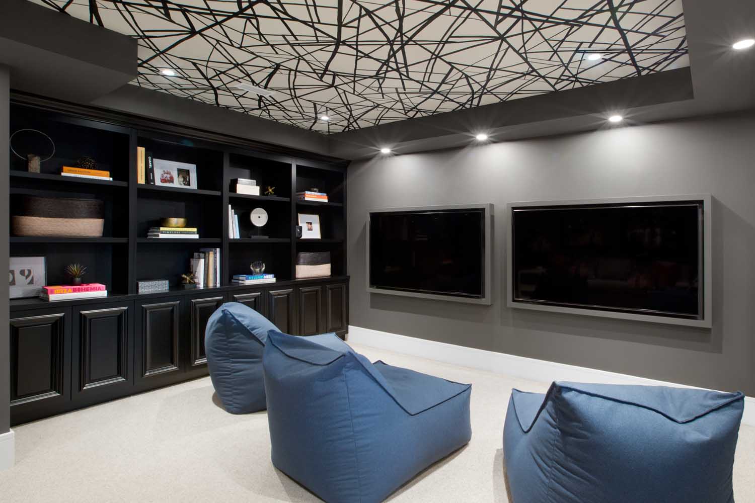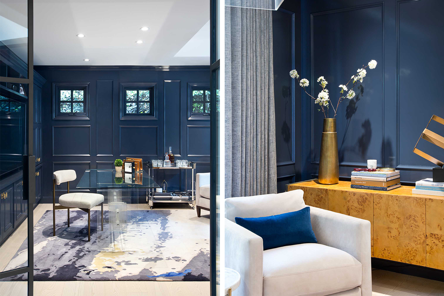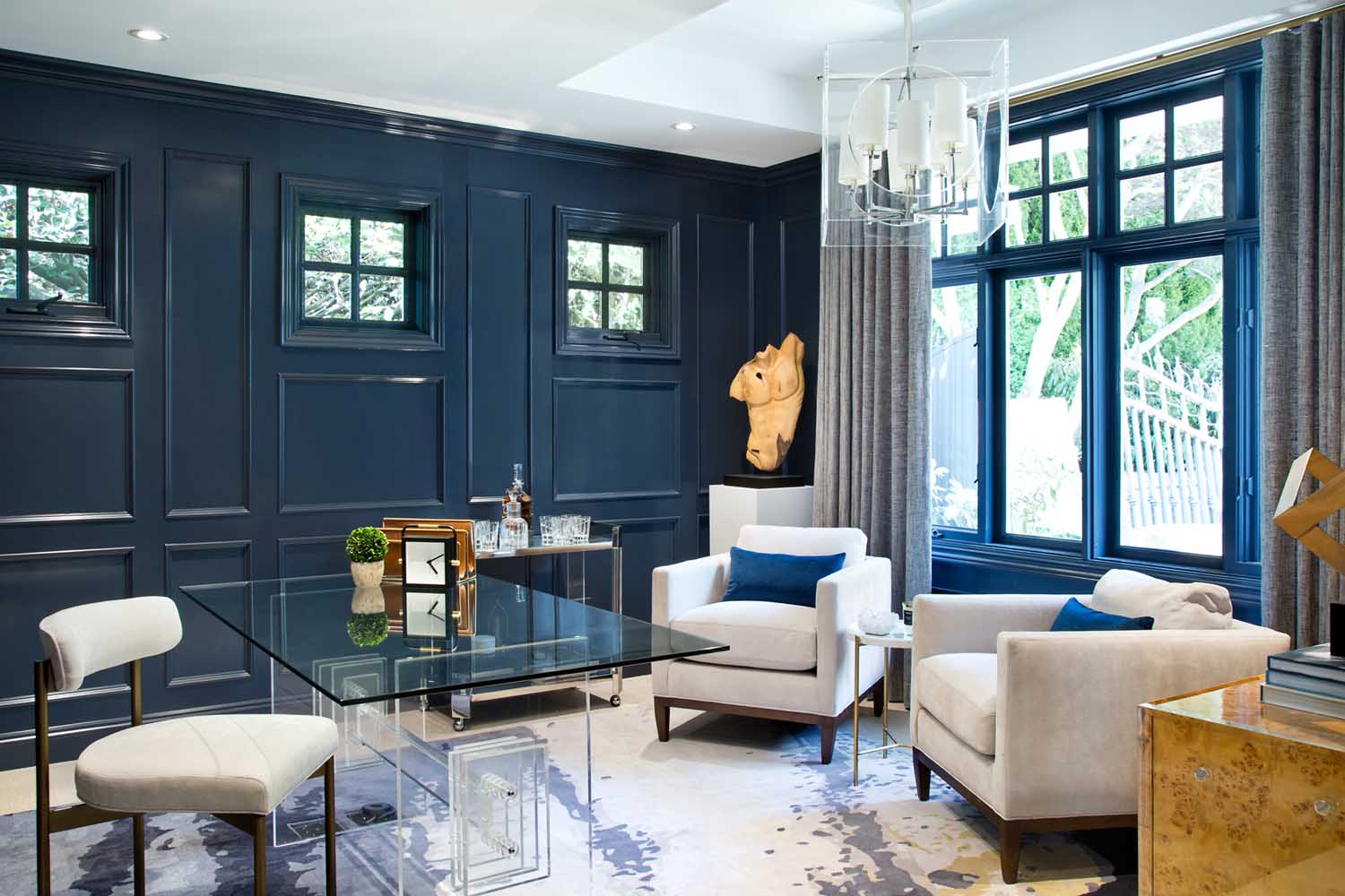 男主人希望有一個(gè)自己在家辦公會(huì)客的空間,因此我們?yōu)槟兄魅诉x擇了更加穩(wěn)重的深藍(lán)色配色,讓整個(gè)空間更具備商務(wù)工作的場(chǎng)景。