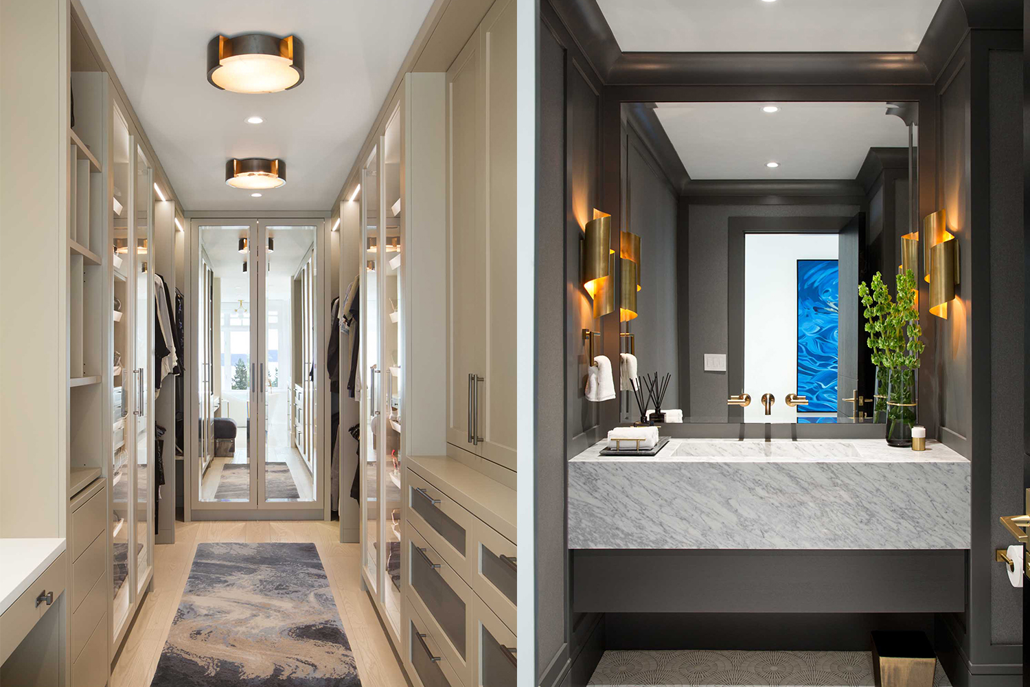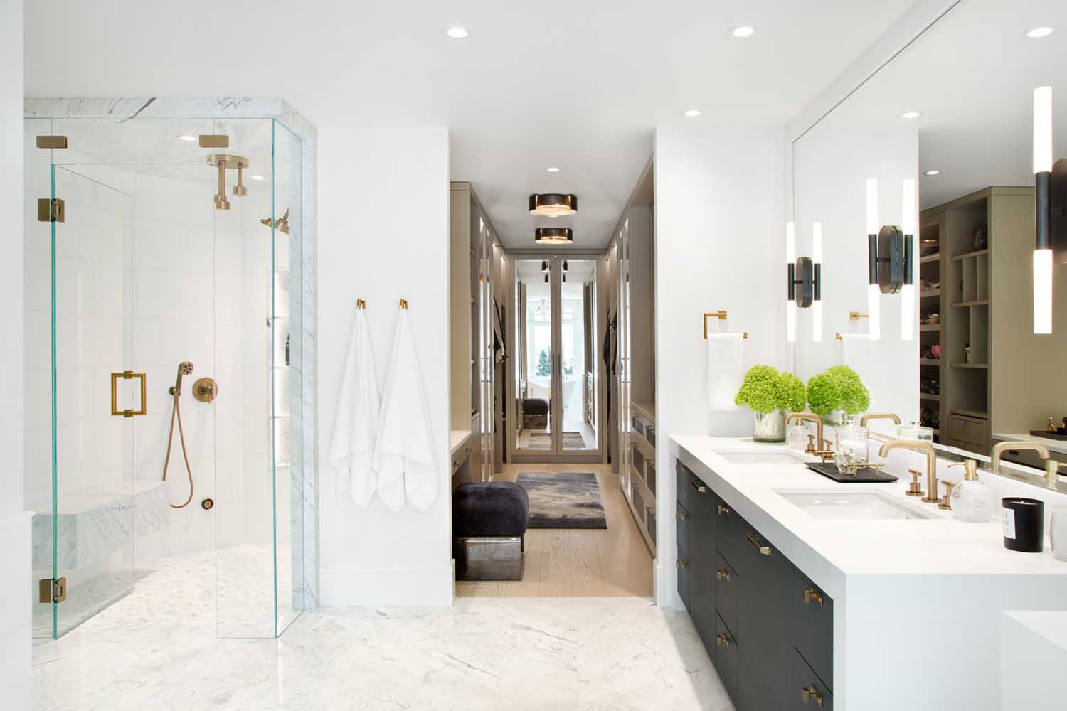衛(wèi)生間的設(shè)計(jì)是業(yè)主比較關(guān)注的空間。我們?cè)O(shè)計(jì)了梳妝臺(tái)來(lái)容納一個(gè)大理石水槽,與明亮的白色臺(tái)面和大理石瓷磚形成強(qiáng)烈對(duì)比,同時(shí)拉出大理石紋理的深色。浴室柜使用了炭灰色門板,配有金色拉絲五金是整個(gè)空間看起來(lái)更加高級(jí),這種金色拉絲的五金運(yùn)用到了幾乎所有空間,這讓各個(gè)空間互相呼應(yīng),風(fēng)格更加協(xié)調(diào)統(tǒng)一。